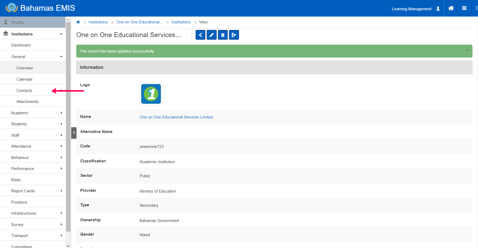 9. Click the edit button (blue pencil icon) at option at the top of the page beside the school name to edit the content